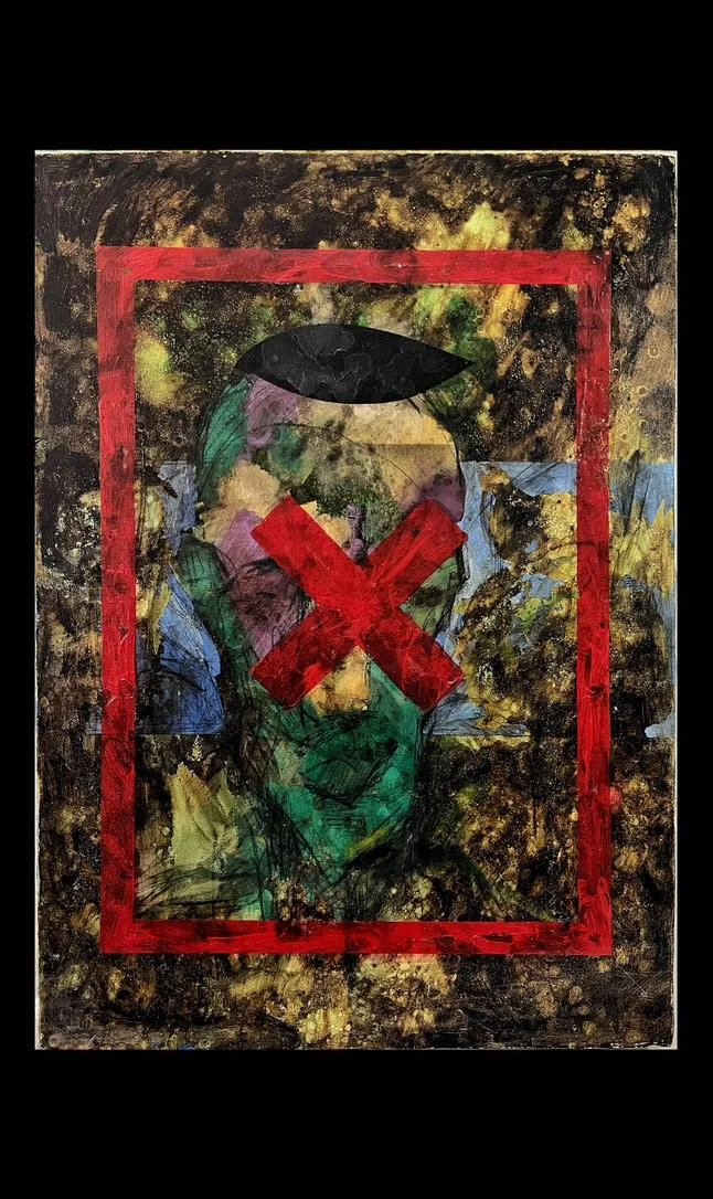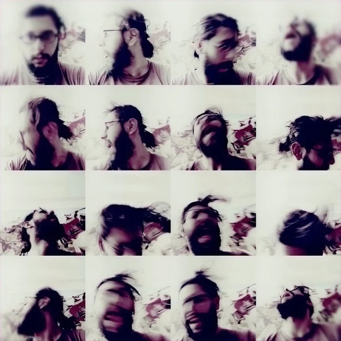 In a more detailed examination of these self-portraits, we come across the color red. Wherever the artist intends to use colors, alongside various grays, he has shown us the color red as his prominent choice, sometimes in the form of a hat he wears, and sometimes in the form of spots of color that are scattered on his face (Image 5). And in other images, this red color is spread across the face and covers the expanse of the artist's face in the photos (Image 6). It is as if the artist, by choosing the warmest possible color, which is in contrast to his calm face and soulless gaze, places a deep contradiction before the audience, and the phrase "sad oriental" and perhaps "angry oriental" can be felt behind these images.