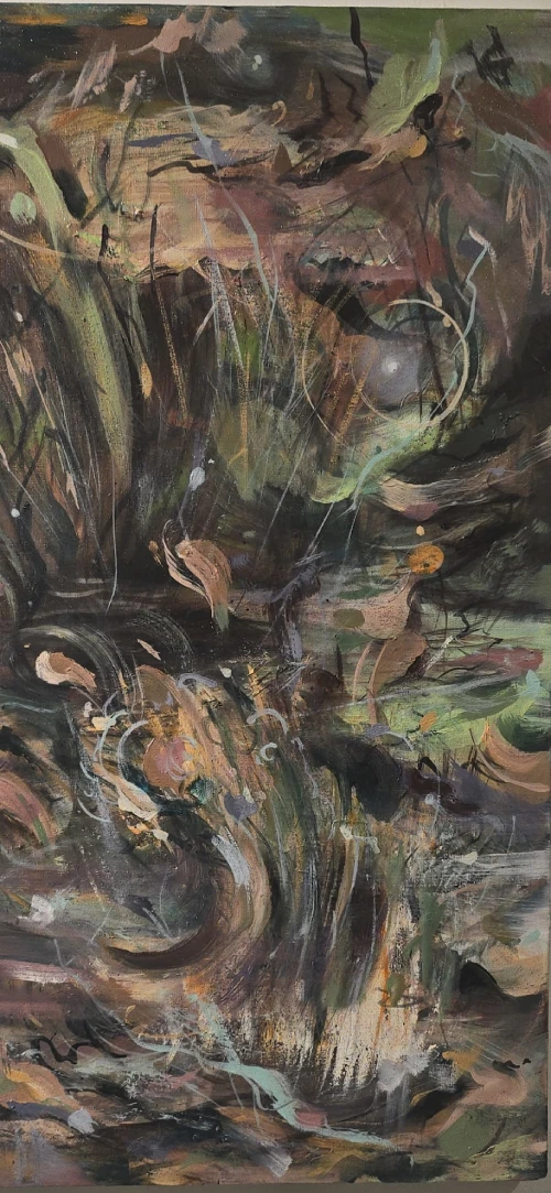 در برخی موارد، ضربهقلمها چنان کنار هم قرار گرفتهاند که فرمهای انتزاعی را به سمت تداعی تصاویر عینی سوق میدهند. جریانهای آب، در برخی نقاشیها به آبشار شباهت مییابند یا ضربهقلمهایی که گیاهی را در حال روییدن از دل مرداب نمایش میدهند، نشانگر پیوند ظریفی میان طبیعت و انتزاع هستند. (تصویر ۳) همنشینی این فرمهای بصری، نهتنها درک مخاطب از ایدهی هنرمند دربارهی تضادها را تقویت میکند، بلکه بُعدی ادراکی و چندلایه به آثار میبخشد. این فرمها، بازتابی از لایههای درونی و بیرونی انساناند که در تعامل مداوم با یکدیگر، تأثیر میپذیرند و تأثیر میگذارند.