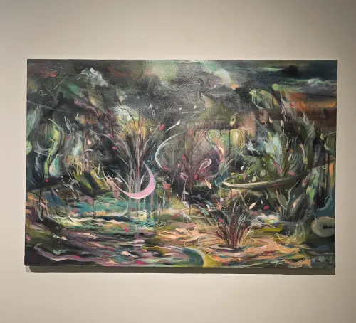 بررسی کلی مجموعهی حاضر، نشاندهندهی تعامل میان دو مفهوم بنیادین، آشوب و زیبایی، است. نقاشیهای جباری، ذهن بیننده را به فضایی رازآلود و مبهم سوق میدهند. در برخی از آثار، وزن بصری رنگها سنگینتر جلوه میکند و نوعی سوگیری ذهنی در مخاطب پدید میآورد. برای مثال، حضور رنگهای سبز، تداعیگر جنگلهایی مرموز و خیالانگیز است. (تصویر ۱) از سوی دیگر، رنگهای روشن که یادآور حضور نور در آثار هستند، در پویایی بصری نقاشیها نقشی کلیدی ایفا میکنند. اما برخلاف سنتهای رایج در نمایش نور، در این کارها منبع نور مشخصی وجود ندارد. گاهی روشنایی در نقاطی متمرکز شده و گاهی در حال گردش و پراکندگی است. این پویایی نوری، حاصل ضربهقلمهای ظریفی است که جلوهای از تلألو و درخشش را به فرمها بخشیدهاند. (تصویر ۲)